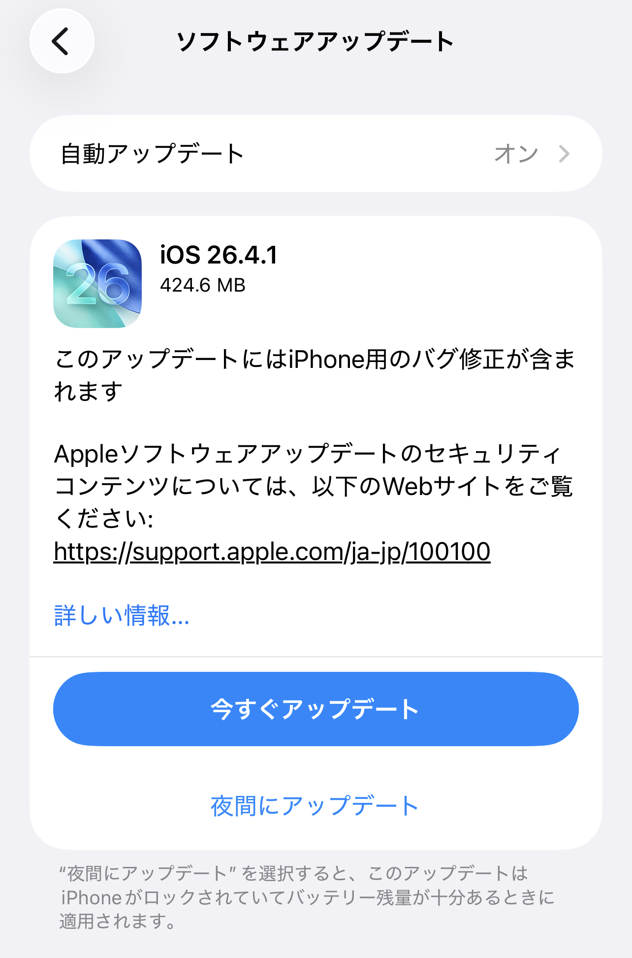 iOS26.4.1は小規模な修正版アップデートのため、一般的にはフルアップデートより容量が小さめになる傾向があります。