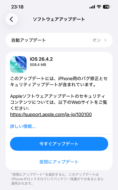 iPhone向けに iOS26.4.2 の配信が始まりました。