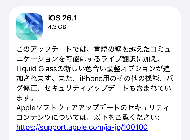 2025年11月4日、iPhone向け「iOS26.1」アップデートが配信されました。