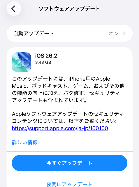 iOS26.2のアップデートサイズと所要時間